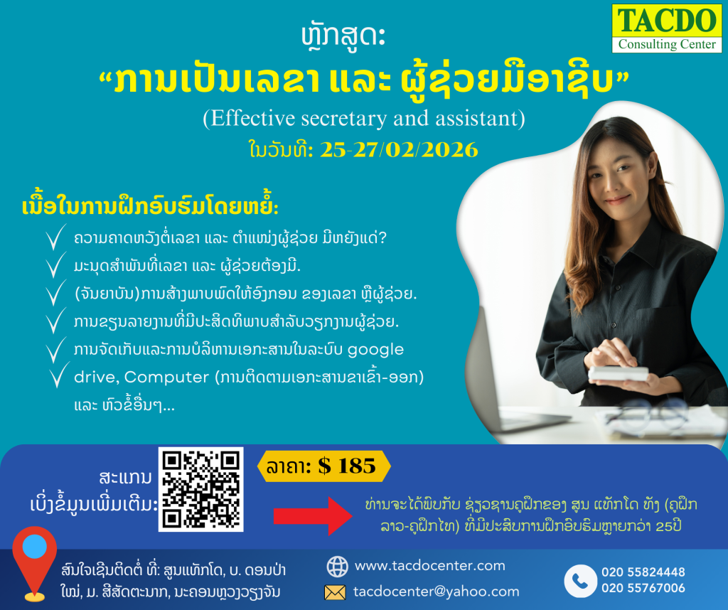 ຫລາຍຄົນເຄີຍເວົ້າວ່າຄວາມກ້າວໜ້າແລະຄວາມສຳເລັດຂອງໜ່ວຍງານ ສ່ວນໜື່ງຂື້ນ ຢູ່ກັບເລຂານຸການ, ນັ້ນໝາຍຄວາມ ວ່າວຽກເລຂາຫລືວຽກຜູ້ຊ່ວຍເປັນວຽກ ທີ່ສຳຄັນຕໍ່ໜ່ວຍ ງານຢ່າງໃຫ່ຍຫລວງ. ເລຂາຄືຜູ້ຊ່ວຍ ແບ່ງເບົາພາລະກິດຂອງຜູ້ບໍລິຫານ, ຊ່ວຍອຳນວຍຄວາມສະດວກ ແລະ ຊ່ວຍໃຫ້ວຽກສຳເລັດລຸລ່ວງເປັນໄດ້ດີ ແລະ ວ່ອງໄວກວ່າເກົ່າ.ແນ່ນອນເລຂາທີ່ດີກໍ່ປຽບສະເໝືອນເປັນມືຂວາຂອງຜູ້ບໍລິຫານກໍ່ວ່າໄດ້.ແຕ່ການເປັນເລຂາທີ່ດີນັ້ນຕ້ອງອາໃສການຮຽນຮູ້,ການພັດທະນາຄວາມຮູ້ຄວາມສາມາດໃຫ້ເປັນບຸກຄົນທີ່ມີຄຸນນະພາບສະລັບຜູ້ບໍລິຫານ.ທາງສູນເຝິກອົບຮົມແທັກໂດຈື່ງໄດ້ຈັດຫລັກສູດເຝິກອົບຮົມນີ້ຂື້ນມາ,ເນື່ອງຈາກວ່າພວກເຮົາເຫັນຄວາມສຳຄັນແລະຄວາມຈຳເປັນຂອງວຽກເລຂາ. ພວກເຮົາຕັ້ງໃຈຢາກໃຫ້ເລຂາໃນປະເທດສປປລາວເຮົາເປັນເລຂາມືອາຊີບແລະເປັນຄົນທີ່ເຈົ້ານາຍໝັ້ນໃຈ ແລະ ຕ້ອງການສະເໝີ. ແນ່ນອນເລຂາຫລືຜູ້ຊ່ວຍເປັນບຸກຄົນທີ່ມີຄວາມສຳຄັນຕໍ່ທຸກອົງການແຕ່ເລຂາທີ່ມີຄວາມ ສາມາດເທົ່ານັ້ນຈື່ງຈະເຮັດໃຫ້ວຽກປະສົບຄວາມສຳເລັດ ແລະ ກ້າວສູ່ຄວາມເປັນເລຂາມືອາຊີບໄດ້ຢ່າງແທ້ຈີງ.