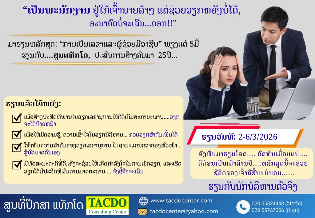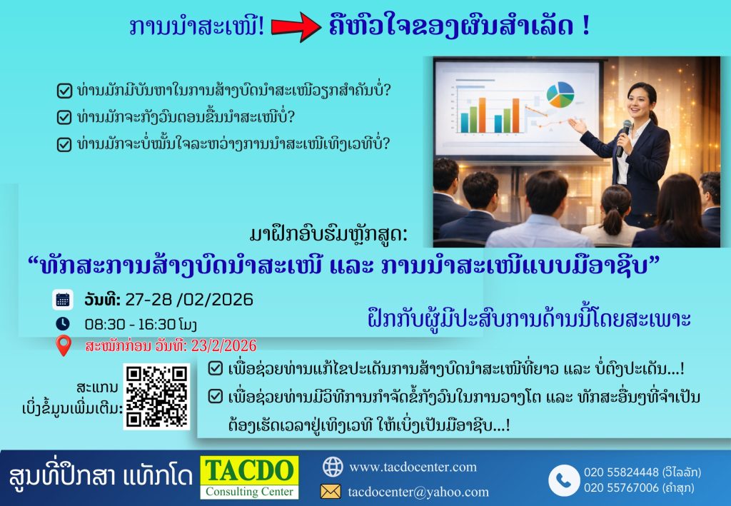 ຄວາມສຳຄັນກ່ຽວກັນຫຼັກສູດຝຶກອົບຮົມ: ຄວາມສາມາດໃນການນຳພາທີ່ມີປະສິດທິຜົນດີຂອງຜູ້ຈັດການເປັນສິ່ງສຳຄັນຫຼາຍເພື່ອໃຫ້ວຽກບັນລຸຜົນສຳເລັດຂອງອົງການຈັດຕັ້ງ, ຊຶ່ງມີຫຼາຍອົງການຈັດຕັ້ງທີ່ເຮັດວຽກງານພັດທະນາຢູ່ໃນປະເທດລາວໃນໄລຍະຜ່ານມາບໍ່ສາມາດບັນລຸຈຸດປະສົງ,ແຜນການ ແລະວິໄສທັດຂອງຜູ້ໃຫ້ທຶນໄດ້ ສາຍເຫດໜຶ່ງແມ່ນມາຈາກການຂາດຜູ້ບໍລິຫານທີ່ມີປະສິດທິພາບ,ຜູ້ນຳ ແລະ ຜູ້ຈັດການປຽບສະເໝືອນຜູ້ບັນຊາເຮືອທີ່ຢູ່ກາງມະຫາສະໝຸດອັນຫວ່າງເປົ່າ. ຜູ້ຈັດການທີ່ບໍ່ມີຄວາມຊຳນິຊຳນານໃນການ ບໍລິຫານຈັດການ ແລະ ເປັນຄົນຂາດຫຼັກການບໍລິຫານທີ່ທັນສະໄໝ ອາດນຳພາໃຫ້ອົງການຈັດຕັ້ງມີຄວາມຫຼົ້ມເຫຼວ,ການຝຶກອົບຮົມຊຸດນີ້ເລັ່ງໃສ່ເຕັກນິກທີ່ເຮັດໃຫ້ເຂົ້າໃຈແຈ້ງຕໍ່ທັດສະນະຄະຕິ ແລະ ພຶດຕິກຳບຸກຄົນ,ແຜນພັດທະນາຕົນເອງ,ການຄຸ້ມຄອງພະນັກງານ, ການແກ້ໄຂບັນຫາ ແລະ ການແບ່ງວຽກທີ່ມີປະສິດທິຜົນ. ຈຸດປະສົງຂອງຫຼັກສູດ 1.ເພື່ອພັດທະນາຜູ້ນຳໃຫ້ມີພື້ນຖານໃນການບໍລິຫານງານ ແລະ ບໍລິຫານຄົນ, ສາມາດນຳພາທີມງານ ຫລື ນຳພາອົງກອນໄປສູ່ຄວາມສຳເລັດໄດ້ຢ່າງຍືນຍົງ 2.ເພື່ອໃຫ້ຜູ້ເຂົ້າອົບຮົມສາມາດນຳຄວາມຮູ້ໄປນຳໃຊ້ໃນການບໍລິຫານໄດ້ ແລະທັກສະກ່ຽວກັບການມອບໝາຍແລະຕິດຕາມງານໄປປະຍຸກໃຊ້ເພື່ອບໍລິຫານຈັດການຜົນງານຂອງທີມງານ ແລະ ພະນັກງານໄດ້ 3.ເພື່ອໃຫ້ຜູ້ເຂົ້າອົບຮົມໄດ້ຮຽນຮູ້ວິທີການວາງແຜນ, ຕິດຕາມງານ ແລະ ພັດທະນາແຜນງານໄດ້ຕາມເປົ້າໝາຍຂອງອົງກອນໄດ້. 4.ເພື່ອໃຫ້ຮຽນຮູ້ເຂົ້າໃຈຄົນ, ເຂົ້າໃຈງານ: ການບໍລິຫານຕົນເອງ ແລະ ທີມງານສຳລັບຜູ້ນຳຢຸກໃໝ່ 5. ເພື່ອສາມາດຈັດແຈງ ບໍລິຫານເວລາ, ເພື່ອບໍລິຫານງານໃຫ້ເກີດປະສິດທິຜົນຢ່າງໜ້າພໍໃຈໄດ້… ຫຼັງຈາກຝຶກອົບຮົມຈະໄດ້ຮັບ: 1. ຜູ້ເຂົ້າຮ່ວມສາມາດບໍລິຫານຈັດການ,ບໍລິຫານທີມງານຂອງທ່ານໄດ້ຢ່າງມີປະສິດທິພາບ ແລະ ມີທັກສະຫຼາຍຂຶ້ນ. 2. ຜູ້ເຂົ້າຮ່ວມມີທັດສະນະຄະຕິ,ແນວທາງໃໝ່, ມີແນວຄວາມຄິດເຕັກນິກຕ່າງໆໃນການຕັດສິນໃຈທີ່ເໝາະສົມ ແລະ ຖືກຕ້ອງ. 3. ຜູ້ເຂົ້້າຮ່ວມເຂົ້້າໃຈທັກສະ ການວາງແຜນ, ການສ້າງສະພາບແວດລ້ອມທີ່ເຮັດວຽກດີ […]